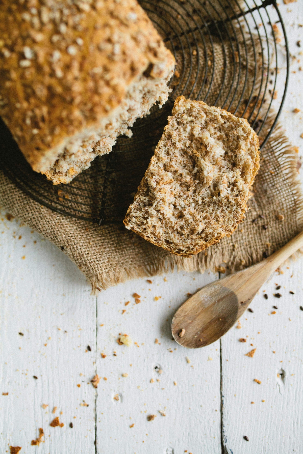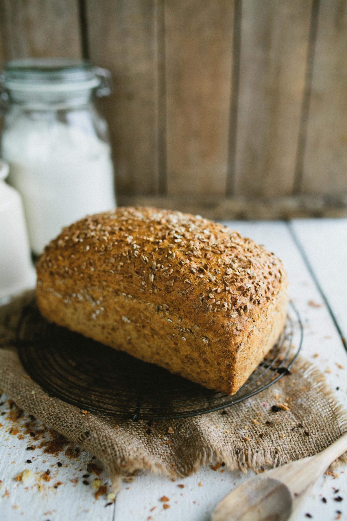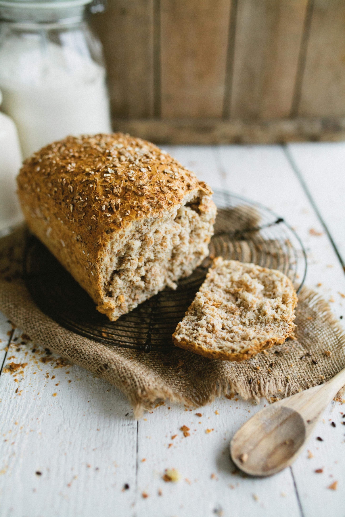 | appearance | rectangular brown bread with wheat flake topping |
