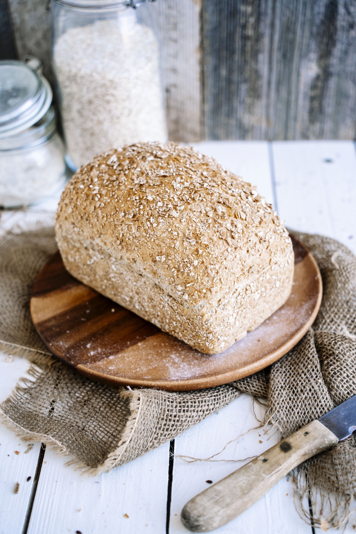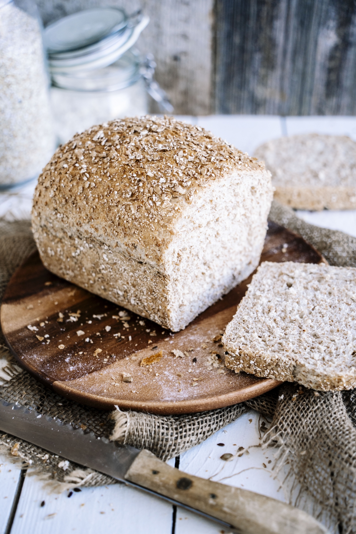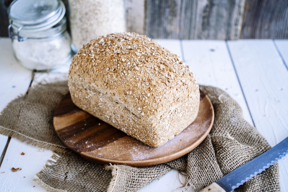| appearance | rectangular brown bread with wheat flake topping |