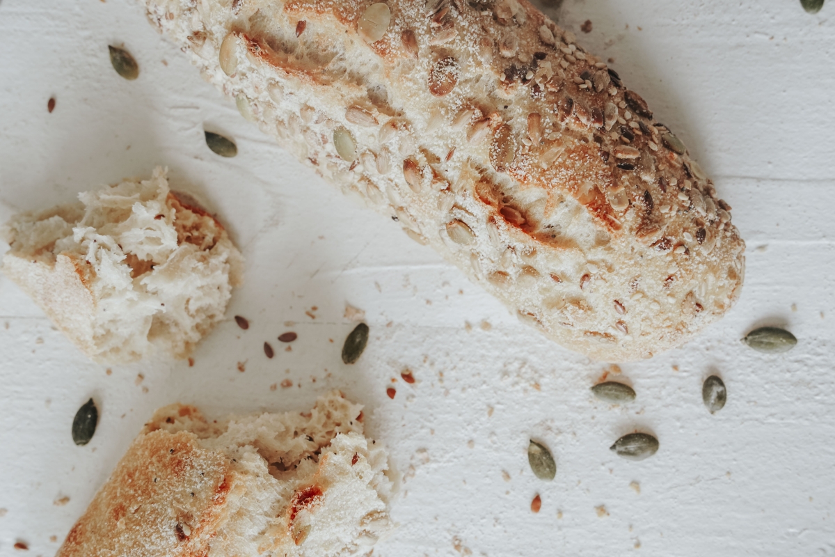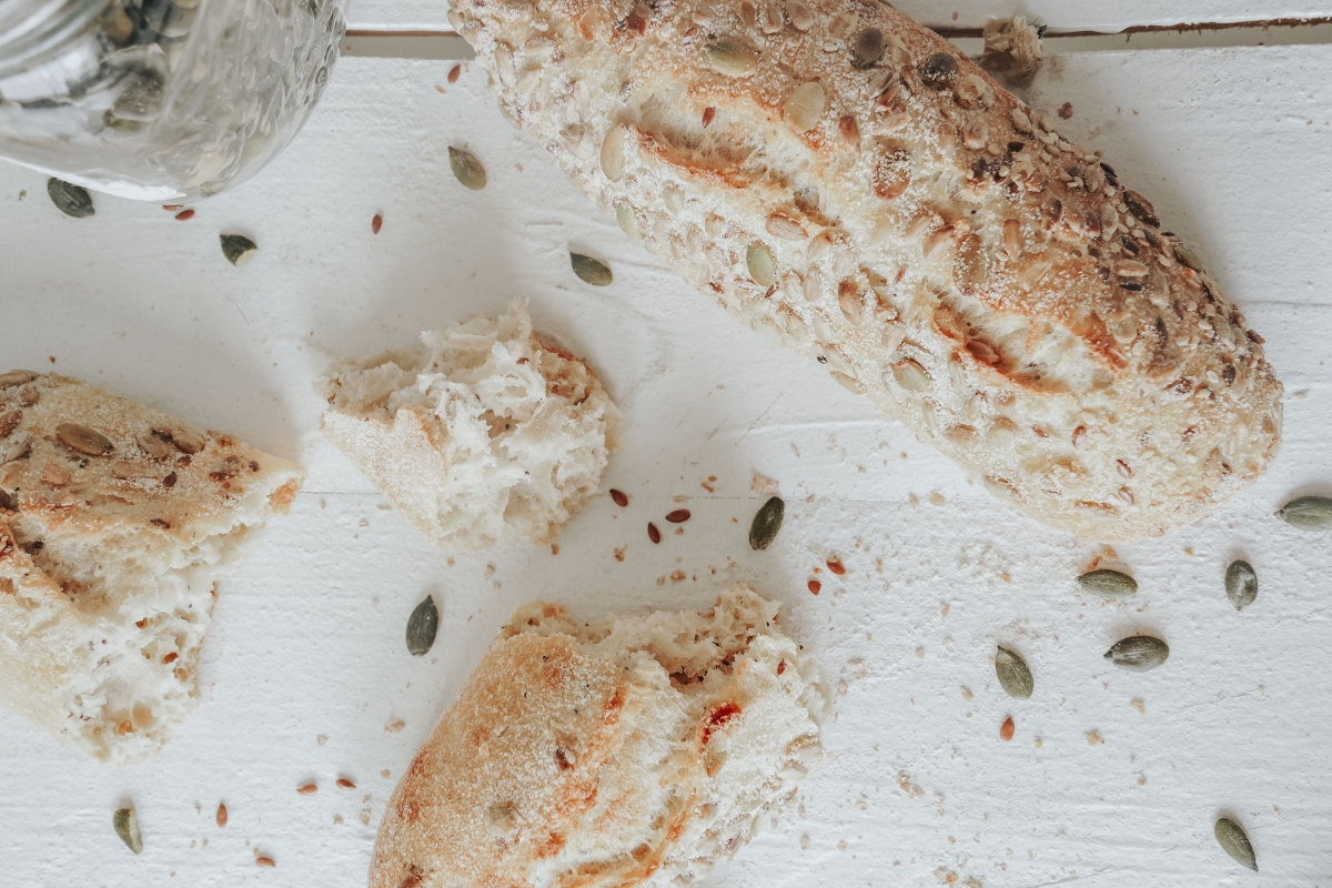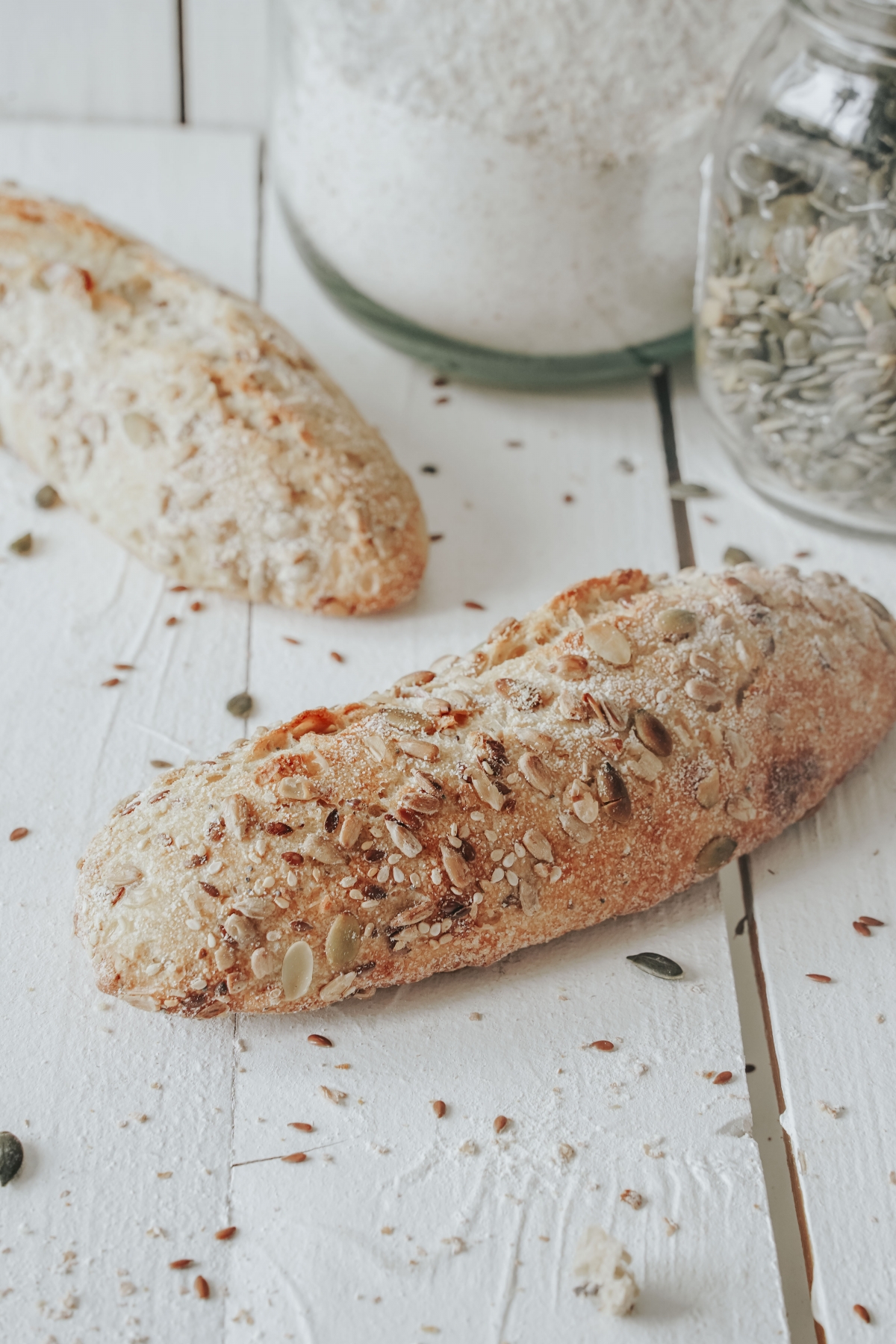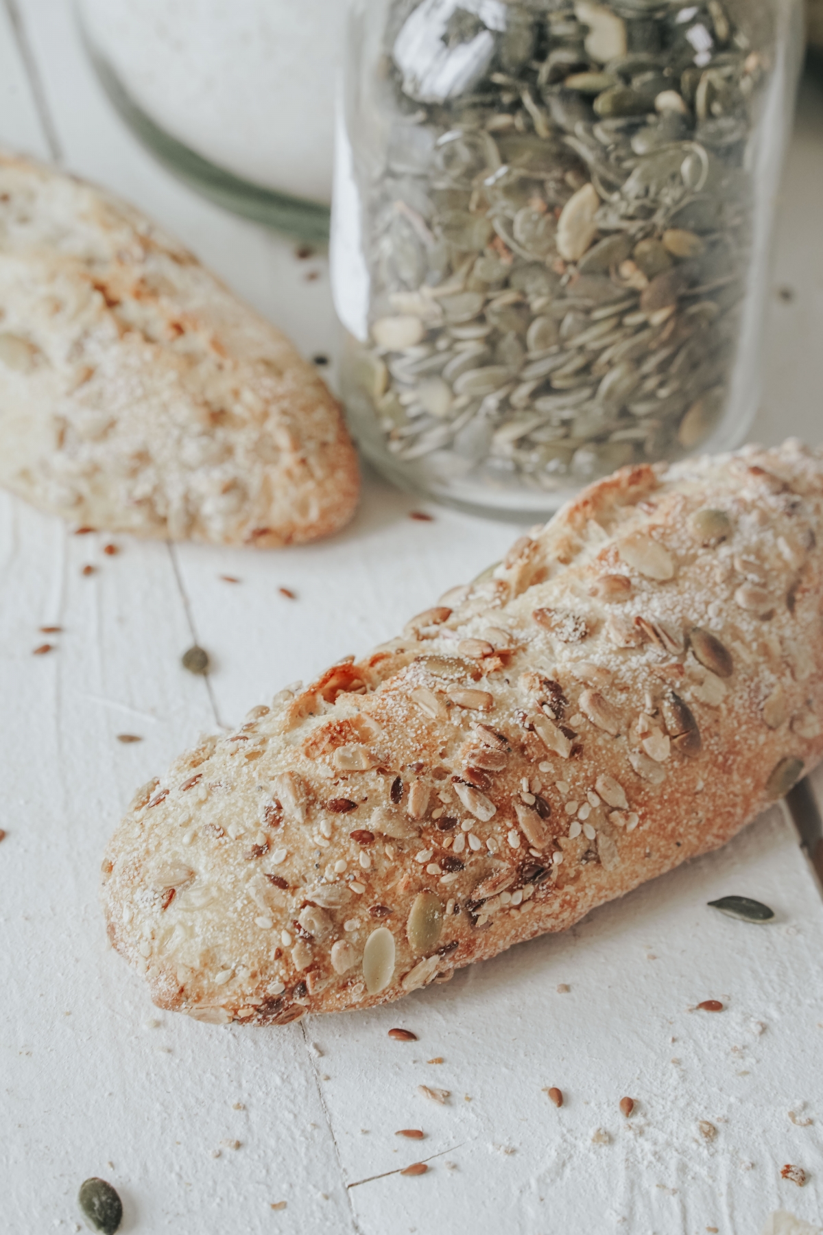 Biologische speltpiccolo met pitten en zaden op Franse wijze gemaakt en op stenen vloer gebakken. Piccolobaguette met luchtige kruim en fijne krokante korst. Met rijke topping en inmenging van pitten en zaden.