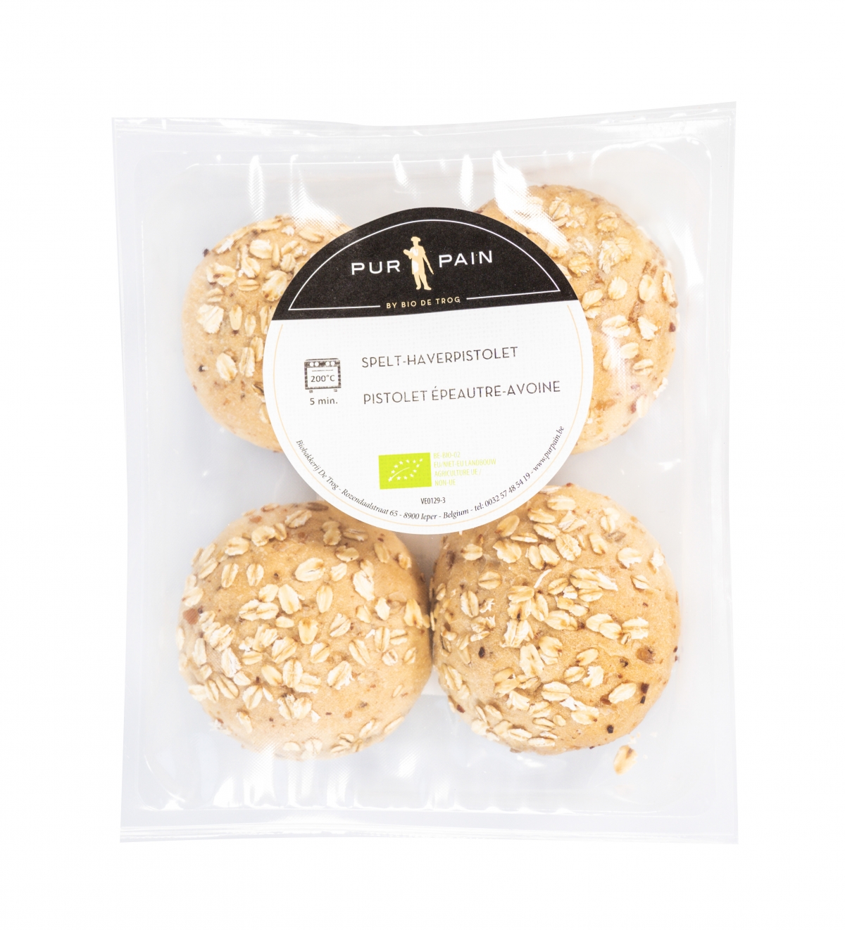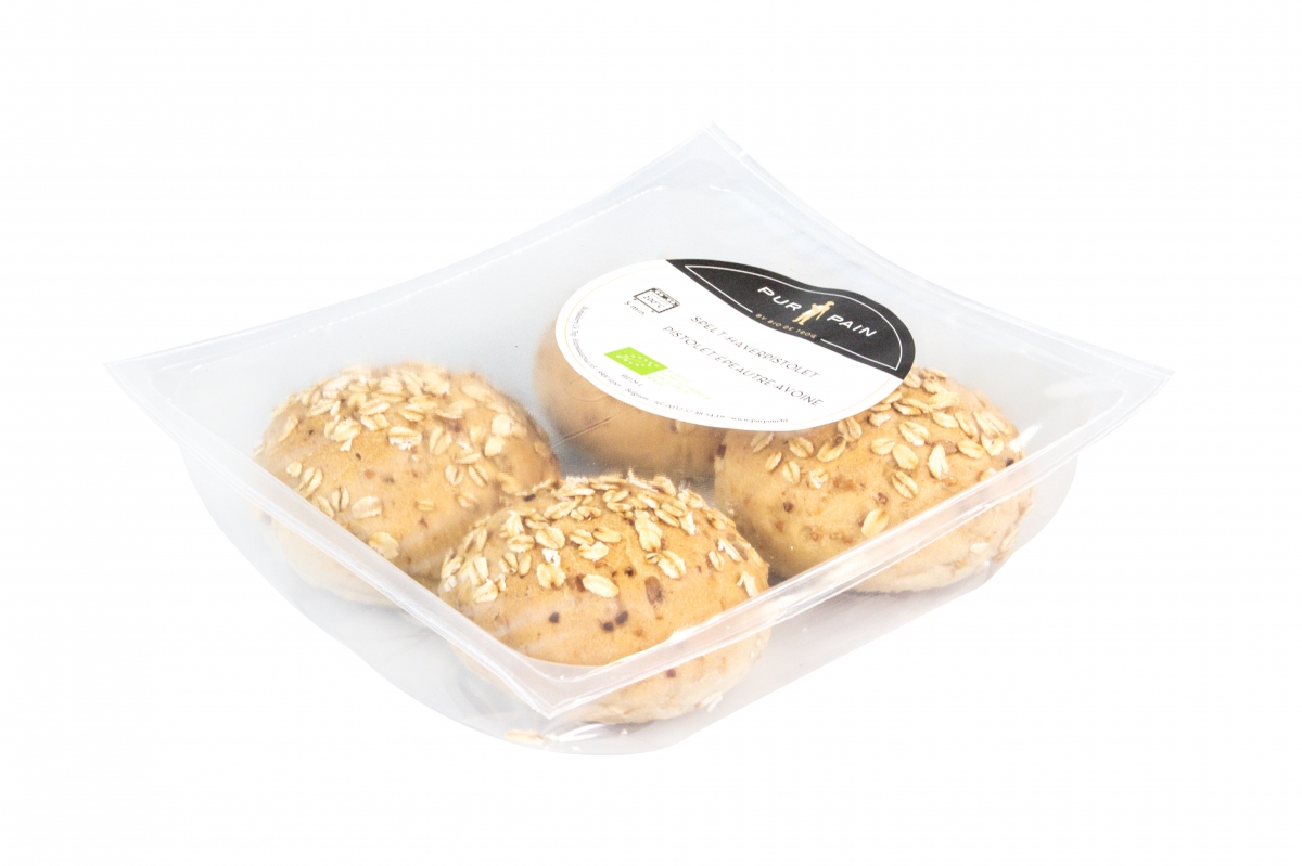 Biologische speltpistolet met topping van havervlokken. Op basis van huisbereide speltdesem.Eigenschappen