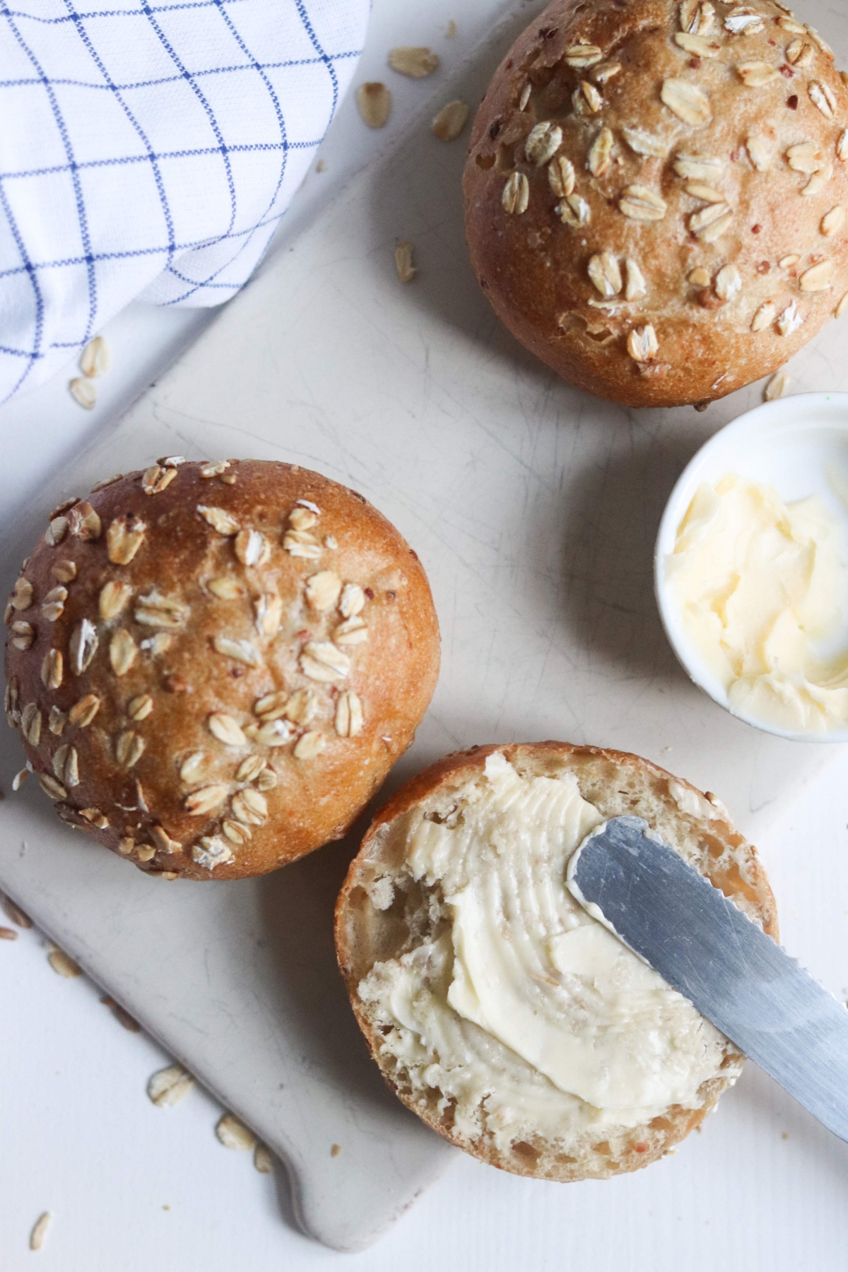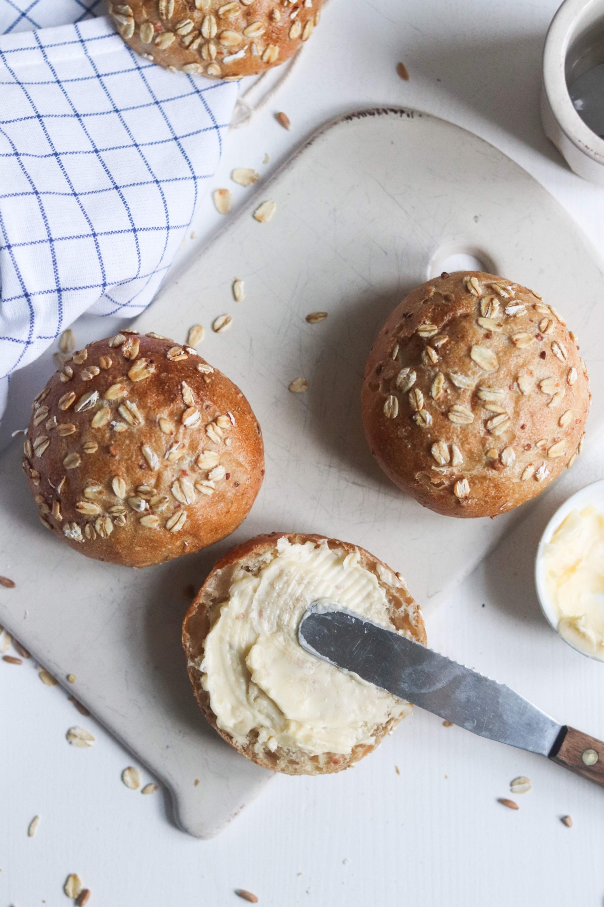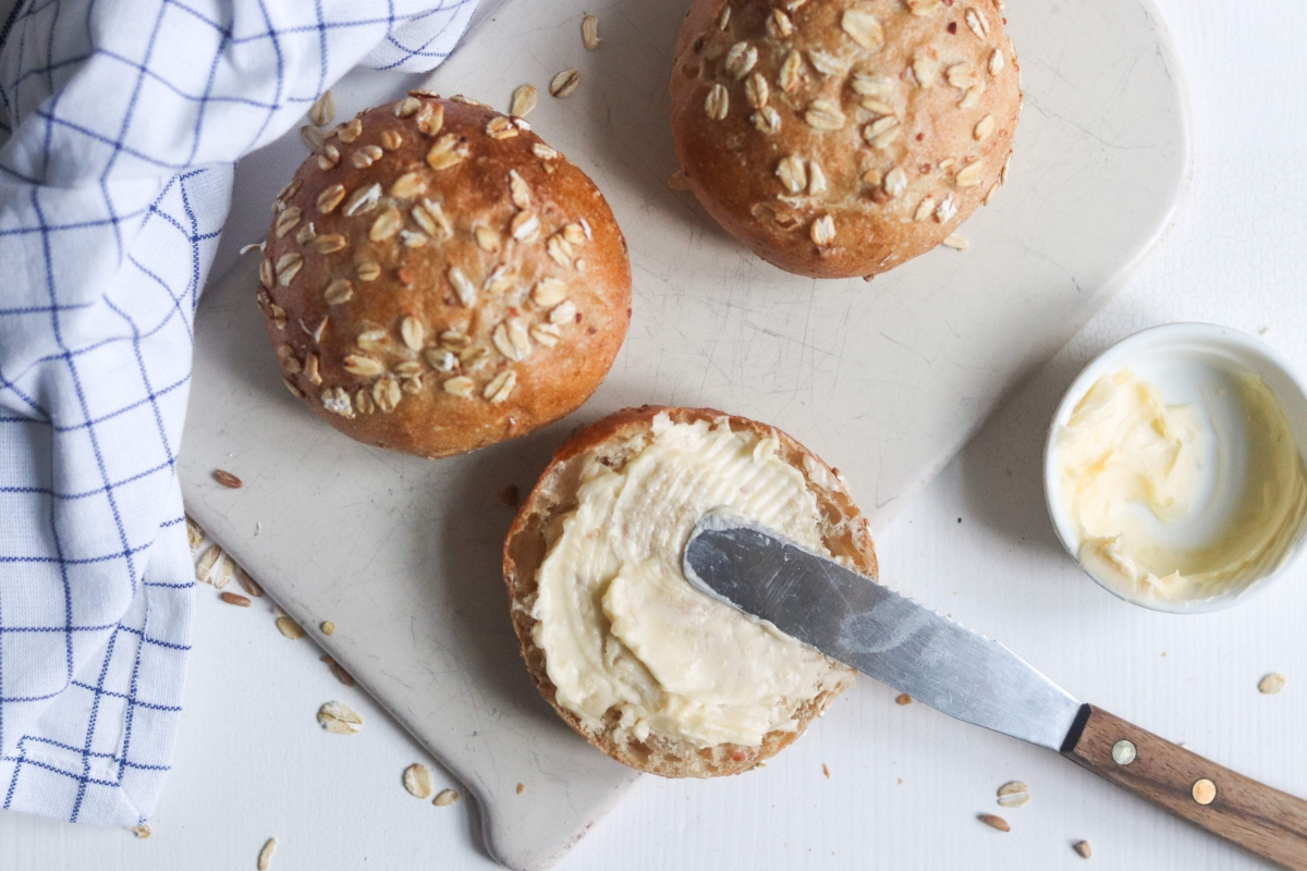| uitzicht | rond lichtbruin broodje met topping van havervlokken |
